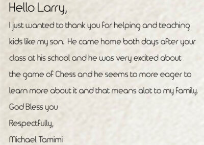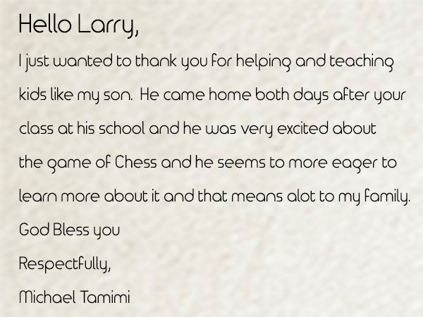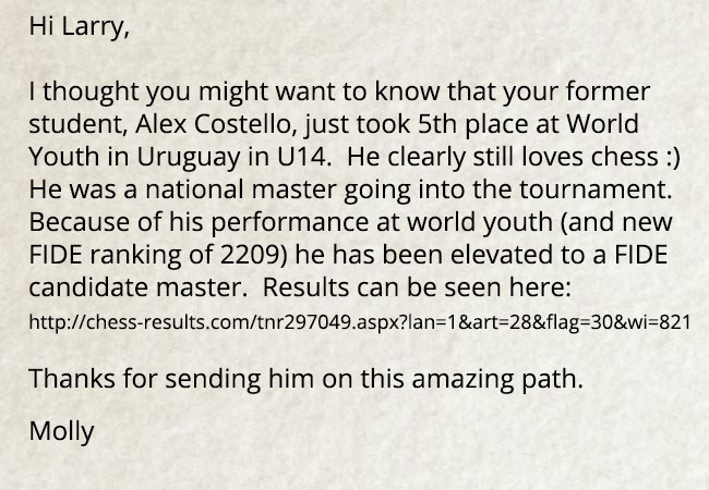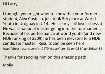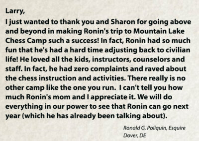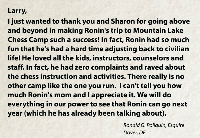 Mountain Lake Chess Camp was founded by International Master Larry Evans in 1992 to help train his son Cory, a prodigy who later became a US scholastic Chess Champion. Since then the company has sponsored scholastic chess tournaments and offered summer camps that have been attended by some of the best players in the world. Mountain Lake has established after-school chess programs in over 60 public and private schools in the San Diego area, and continues to provide private chess lessons for all levels.